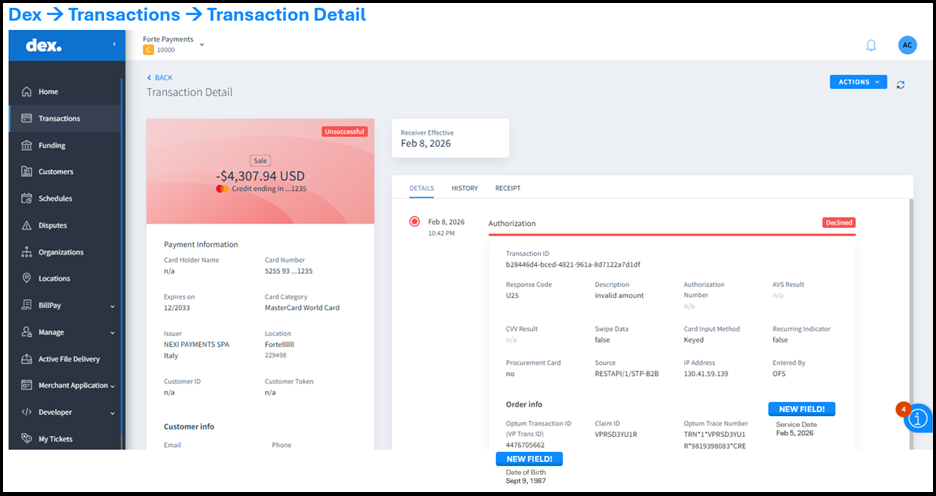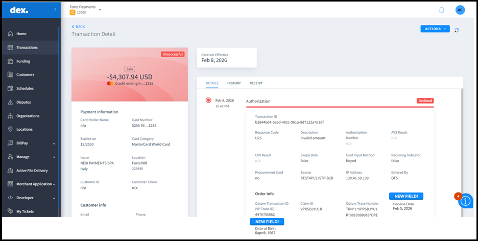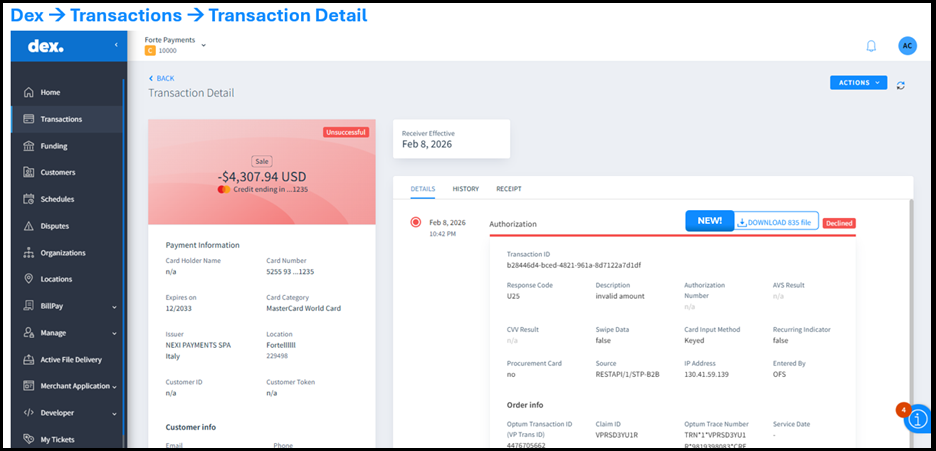 - Straight Thru Processing: Enabled direct 835 file downloads in Dex for eligible Healthcare merchants enrolled in Straight Thru Processing.