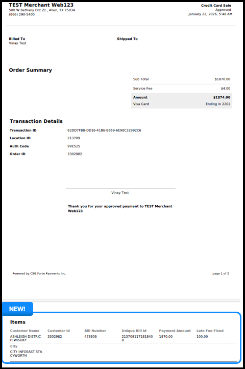Once configured, recipients receive an email notification with a PDF receipt that includes itemized transaction details.